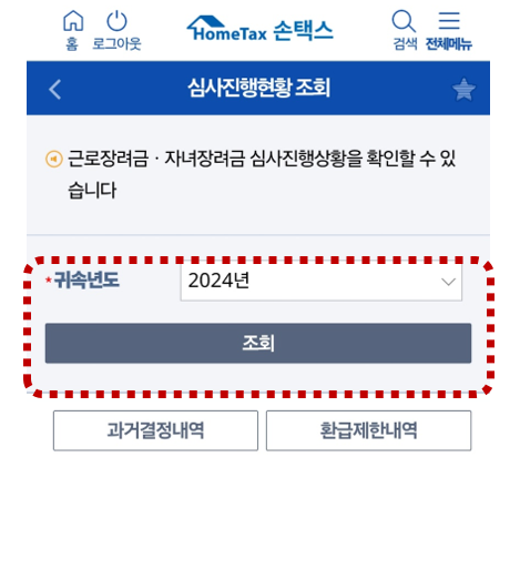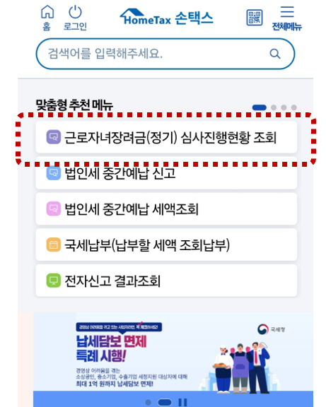 2. 메인 화면에서 근로·자녀장려금(정기)심사진행현황 조회 메뉴 선택