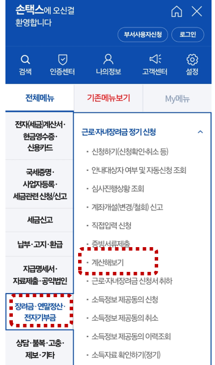 4. 근로장려금 계산 클릭 →