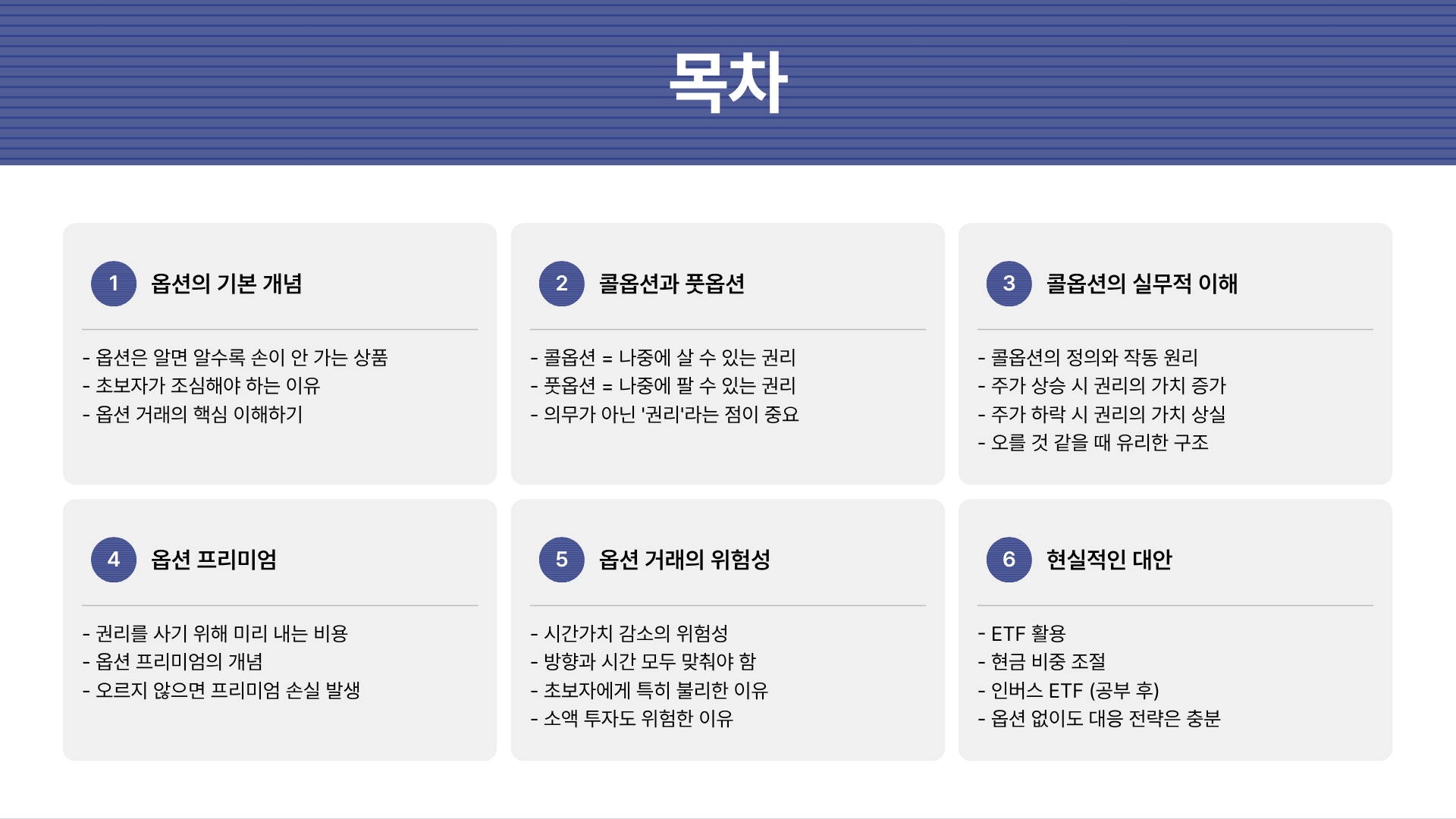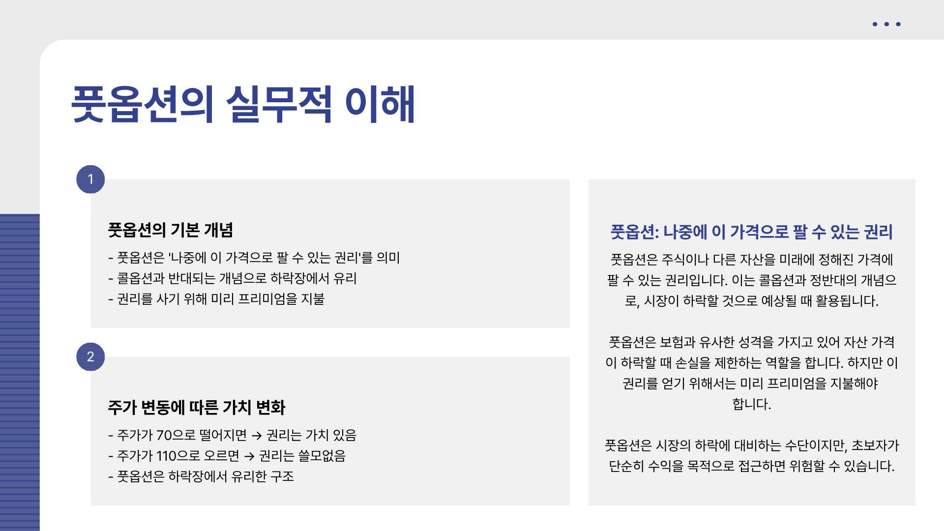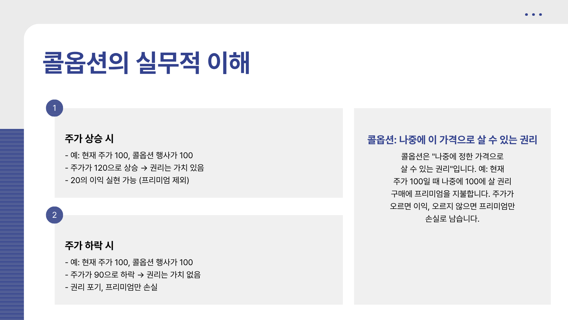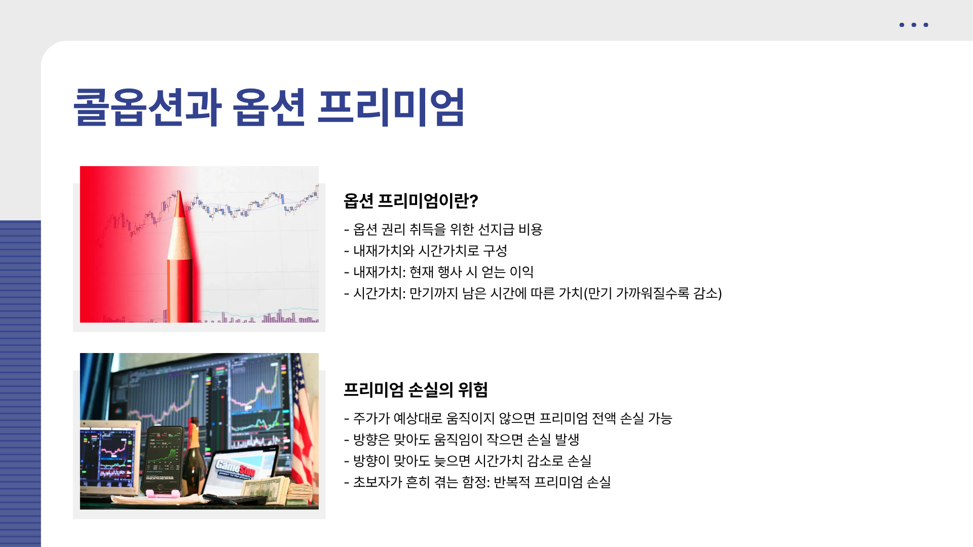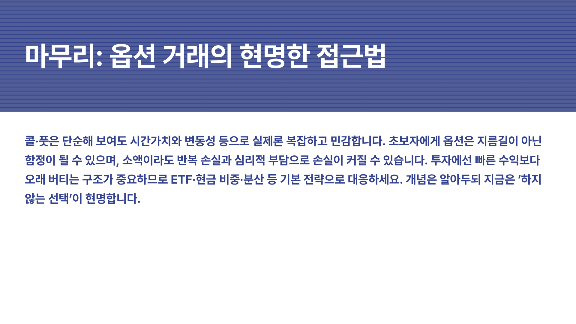콜옵션과 풋옵션은 잘 활용하면 강력한 도구지만, 구조 이해 없이 접근하면 위험할 수 있습니다.